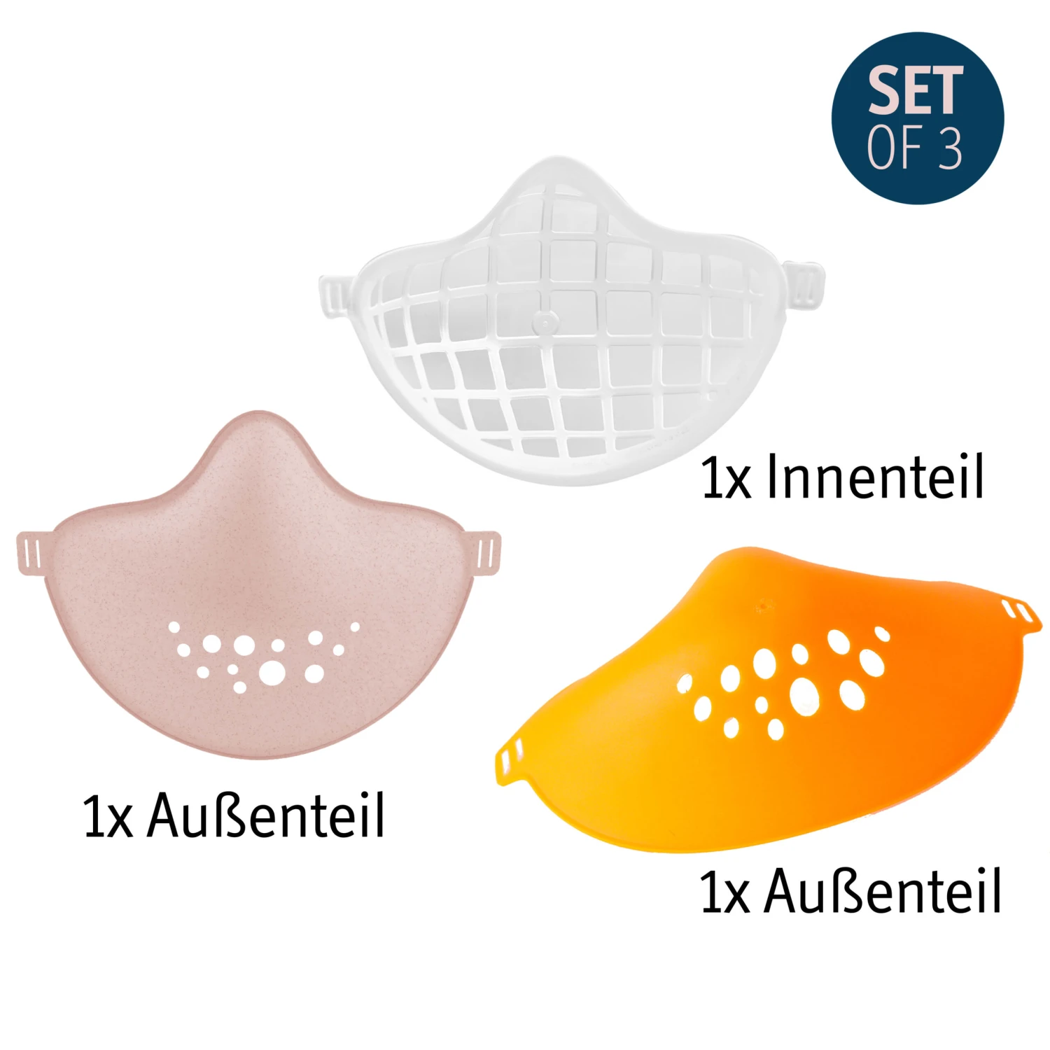 Die Maske ist dreiteilig aufgebaut. Zwischen Maskenkörper und Innenteil wird ein Schutzvlies eingelegt, das man nach Bedarf jederzeit auswechseln kann. Wir empfehlen die HI Ersatzfilter, es kann aber auch jeder andere atmungsaktive Stoff verwendet werden.